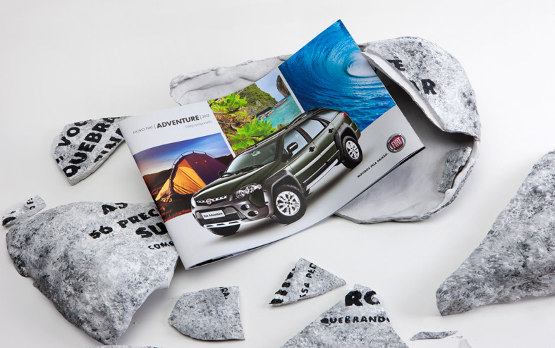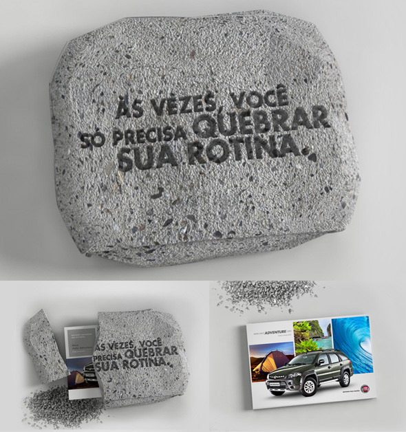 Mala Direta para Lançamento do Novo Fiat Adventure. Uma pedra era entregue para os SIP's e blogueiros que deveria ser quebrada para ter acesso ao catálogo do carro. Quebre a rotina, quebre essa pedra.